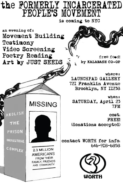 Women on the Rise Telling HerStory (WORTH) is collaborating with other NYC activists to hold a free event at Launchpad Gallery, 721 Franklin Avenue, in Brooklyn. Participants include FICPM Steering Committee members Tina Reynolds (WORTH), Jazz Hayden (All Things Harlem), and Bruce Reilly (Direct Action for Rights & Equality; Unprison).