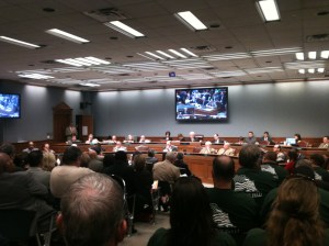 Today’s hearing was action-packed, to say the least, with nearly 200 people in the room. Over 50 wore matching t-shirts; but rather than your typical grassroots activists demanding humane treatment for prisoners, the people were prison employees and spouses standing in solidarity. After all, prisons in America are primarily protected and supported as jobs programs rather than as a societal need. Avoyelles prison was built because a judge ordered Louisiana to stop overcrowding, and it was unenthusiastically accepted in the parish as a way to employ locals. Unemployment at that time, according to former Avoyelles Rep. Raymond Laborde, was 12-14%.