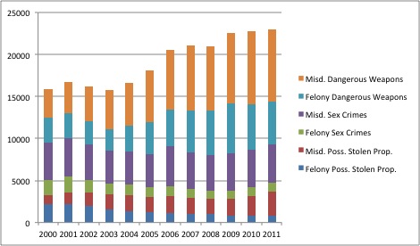 Felony Possession of Stolen Property has gone down while Misdemeanor Possession of Stolen Property has gone up;- Felony Sex Crimes has gone down while Misdemeanor Sex Crimes has gone up.
